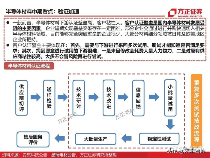 一般而言,半导体材料下游认证壁垒高,客户粘性大。客户认证壁垒是国内半导体材料发展受 阻的主要因素,企业短期实现壁垒突破存在一定困难,部分企业会通过进行并购快速切入相关 半导体材料领域。目前能够完全突破壁垒的企业很少,大部分材料细分领域被日韩及欧美地区 企业所把持。