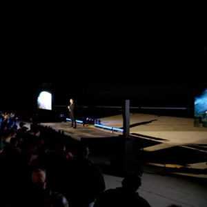 发布会的地点就是位于美国得克萨斯州的星舰测试基地,甚至所有观众就围绕在一个简易的露天讲台、投影面板和两台火箭发动机旁边,果真是非常硬核的工业风格发布会。