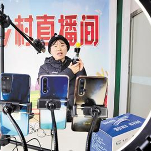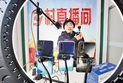 2月10日,在乐亭数字乡村(韩坨村)运营服务中心乡村直播间,村民通过手机直播平台向网友推销家乡特产。河北日报记者 王育民 摄