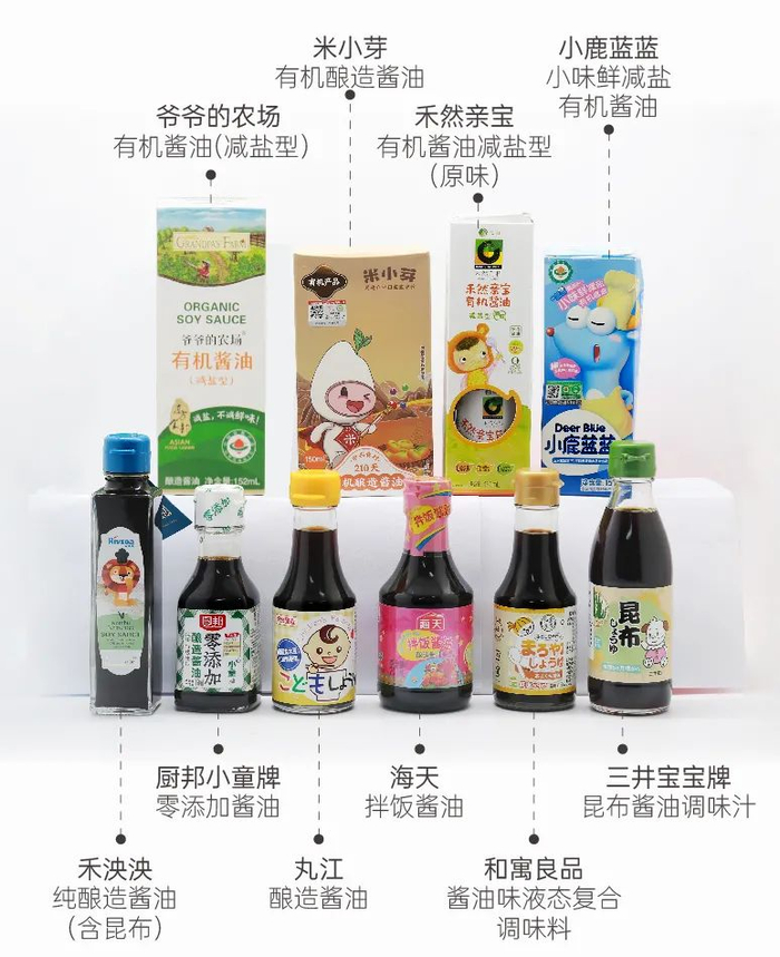 测试结果显示,三井宝宝牌昆布酱油调味汁、和寓良品酱油味液态复合调味料、海天拌饭酱油、厨邦小童牌零添加酱油等4款产品了添加了增鲜剂。