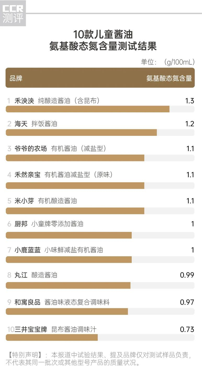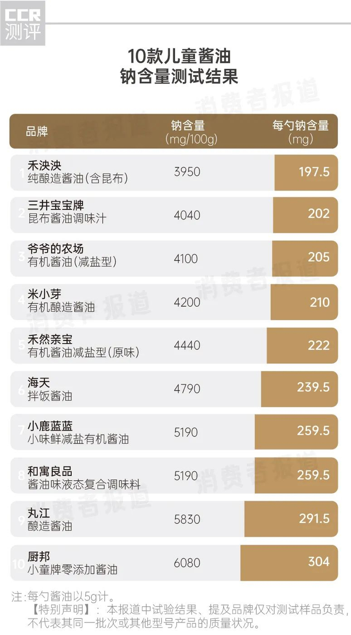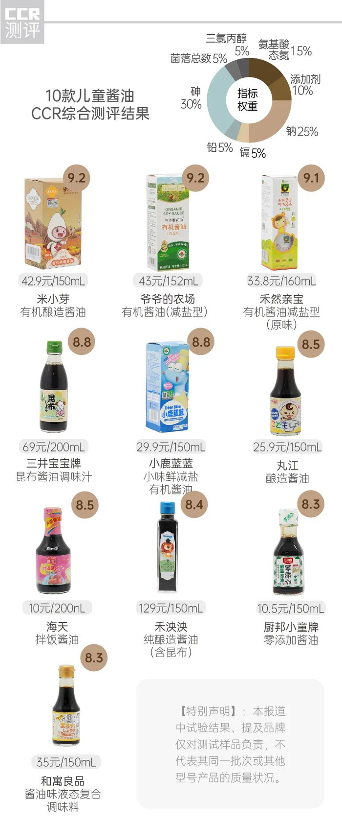 8、由于钠含量较高、食品添加剂较多或重金属含量较高等原因,厨邦小童牌零添加酱油、和寓良品儿童酱油调味汁、禾泱泱黑豆纯酿造酱油等3款表现较逊,CCR得分分别为8.3、8.3和8.4。