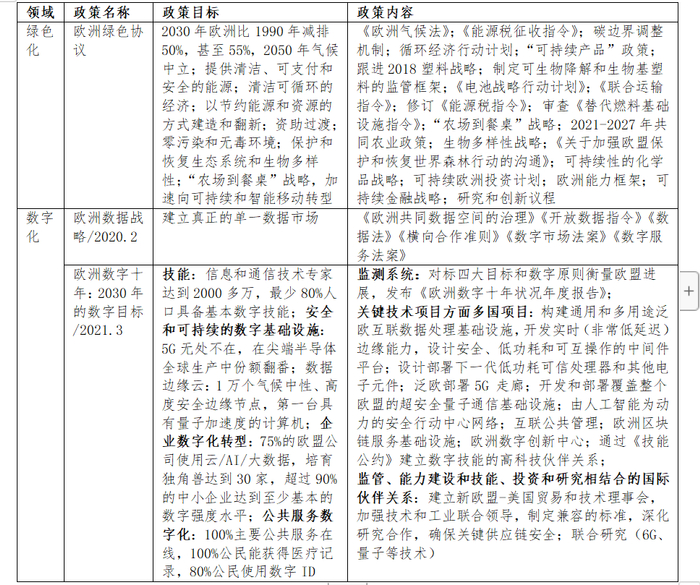 据初步统计,2020年初以来,冯·德莱恩领导的欧盟委员会新一届委员会发布了30多份政策文件,重点支持欧盟绿色化和数字化双重转型,意图依托欧洲强大的单一市场、传统的高端制造基础和数字能力的补强,提升欧盟整体竞争力和在世界新秩序下的领导地位。