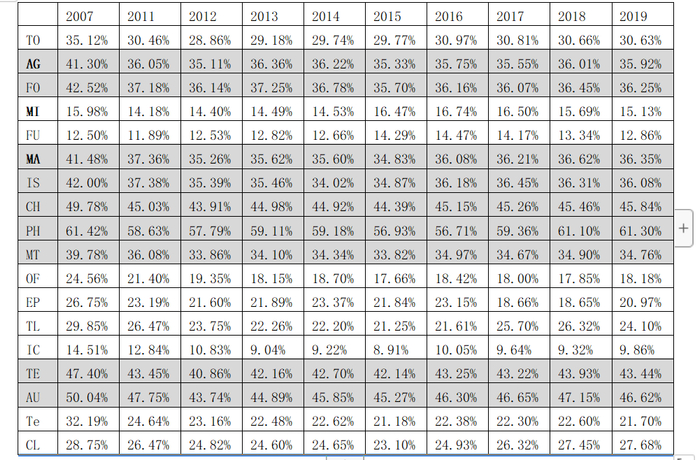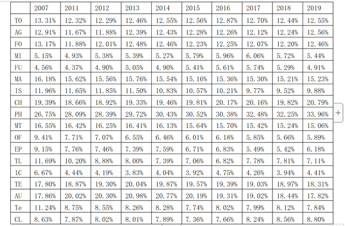 表中第一列字母意义:TO为总出口、AG为农产品、FO食物、MI燃料和矿产品、FU燃料、MA制成品、IS钢铁、CH化学品、PH药物、MT机器和交通设备、OF办公和电信设备、EP电子数据处理和办公设备、TL电信设备、IC集成电路和电子元件、TE交通设备、AU汽车产品、Te纺织品、CL服装。