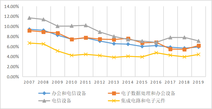 图1 欧盟出口世界的部分行业市场份额走势(2007-2019)