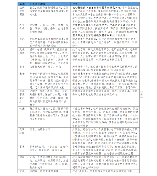注:13个生态系统数据来源于NACE修订版2的分类,因为以生态系统为单位,部门行业分类有重复。另,欧盟2021年单一市场报告中提炼出14个产业生态系统,本文有13个,其中邻近经济、社会经济组织和公民安全生态系统没有纳入,因为该生态系统主要服务于国内市场。