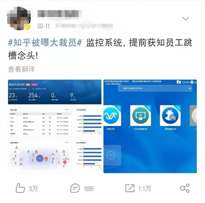 对于网上该系统的截图,知乎从未接触过,因此也不清楚其真实性。核查后发现,事件源头是某KOL将一张疑似监测员工离职软件系统的截图发在网上,并被部分人曲解、联想到知乎身上。