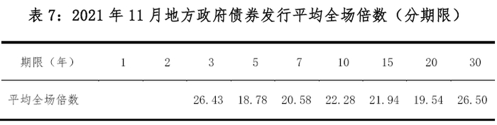 从认购倍数看,11月地方政府债券发行平均全场倍数3为22.09倍。其中,一般债券20.54倍,专项债券22.24倍。不同期限债券发行平均全场倍数见表7。