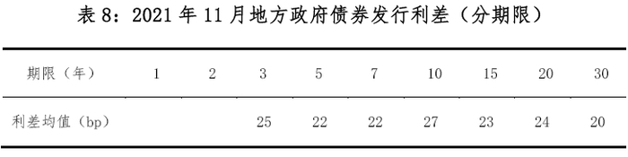从债券发行利差4看,11月地方政府债券发行利差区间为14bp-41bp,利差均值5为24bp。环比利差区间扩大,下限上升9bp,上限上升13bp,利差均值上升4bp。不同期限债券发行利差见表8。