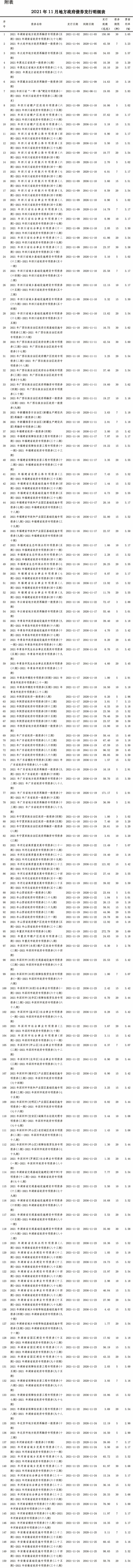 截至11月末,全国地方政府债券余额300,214.99亿元,其中一般债券余额136,041.48亿元,专项债券余额164,173.51亿元。地方政府债券剩余平均年限7.8年(其中一般债券6.3年,专项债券9.1年),比2020年末增加0.9年。地方政府债券平均利率3.51%,其中一般债券3.51%,专项债券3.51%。