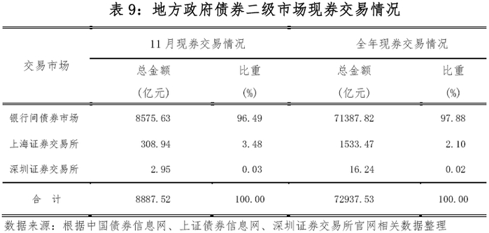 11月,地方政府债券二级市场现券交易金额8,887.52亿元。其中,银行间债券市场8,575.63亿元,上海证券交易所308.94亿元,深圳证券交易所2.95亿元。当月现券交易日平均换手率为1.36‰。