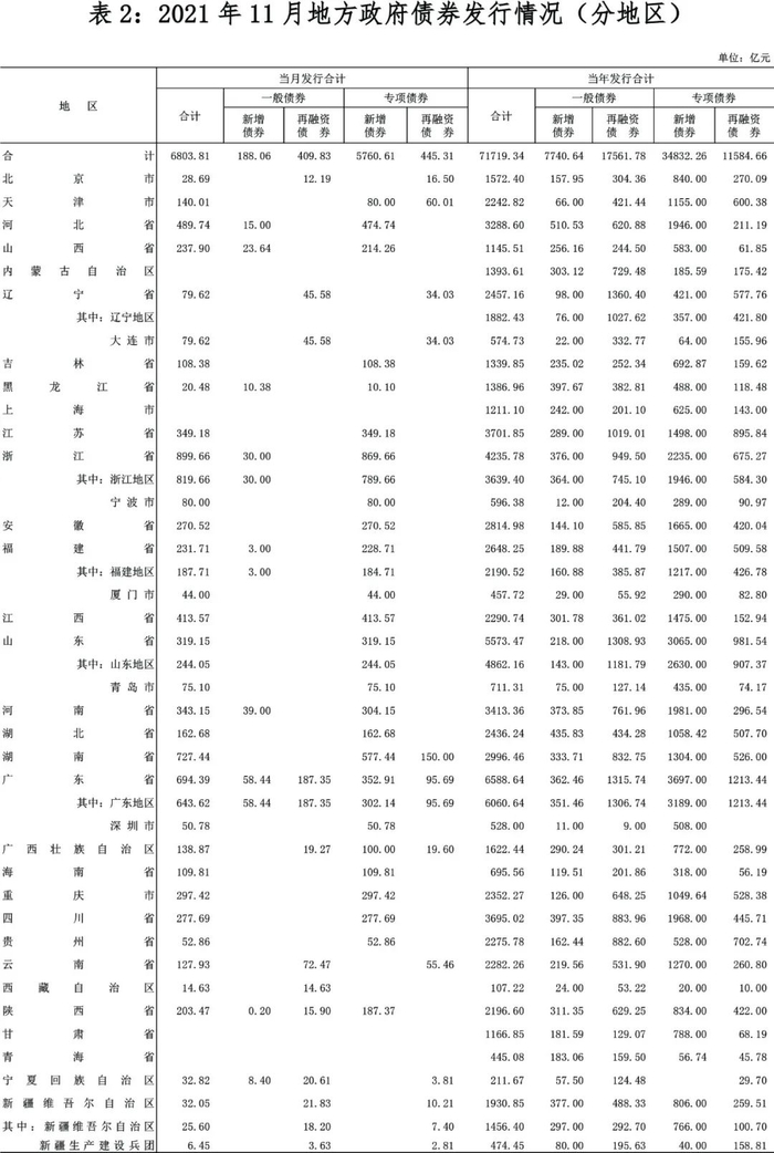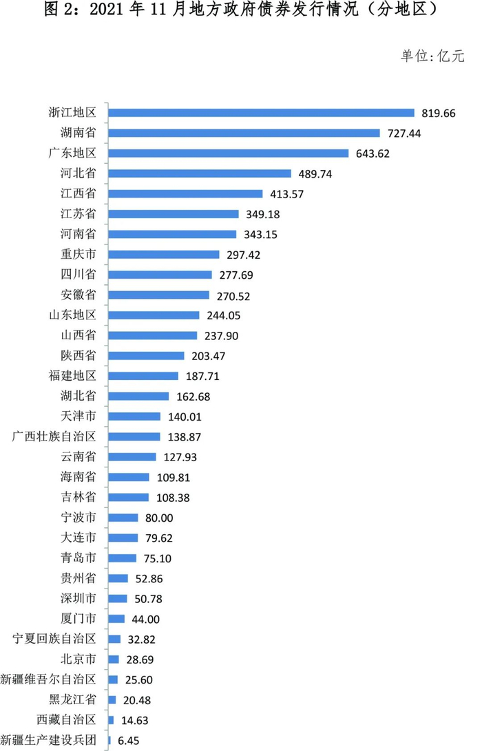 从发行地区看,31个省、自治区、直辖市、计划单列市及新疆生产建设兵团11月发行了地方政府债券(见表2)。债券发行规模较大的有浙江地区819.66亿元、湖南省727.44亿元、广东地区643.62亿元(见图2)。