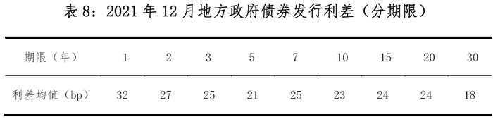 从债券发行利差4看,12月地方政府债券发行利差区间为11bp-44bp,利差均值5为23bp。环比利差区间扩大,下限下降3bp,上限上升3bp,利差均值下降1bp。不同期限债券发行利差见表8。