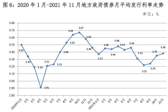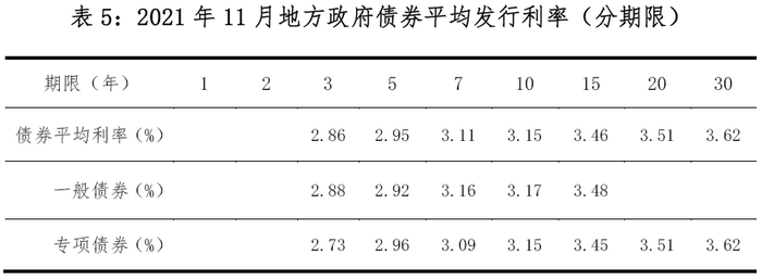 11月,地方政府债券平均发行利率3.38%,环比上升3bp,同比下降20bp。其中,一般债券3.06%,专项债券3.41%。今年1-6月,平均发行利率在3.37%-3.48%之间窄幅波动,主要是货币市场利率走势较为平稳。第三季度,平均发行利率下降明显,主要是央行7月降准,8、9月货币政策稳健,市场流动性保持合理充裕。10月平均发行利率抬升,主要是宽货币预期有所减弱,地方债供给压力等导致。11月平均发行利率小幅上升,主要原因是10年及以上期限债券占比环比增加较多。2020年1月-2021年11月地方政府债券月平均发行利率走势见图6。2021年11月不同期限地方政府债券平均发行利率见表5。