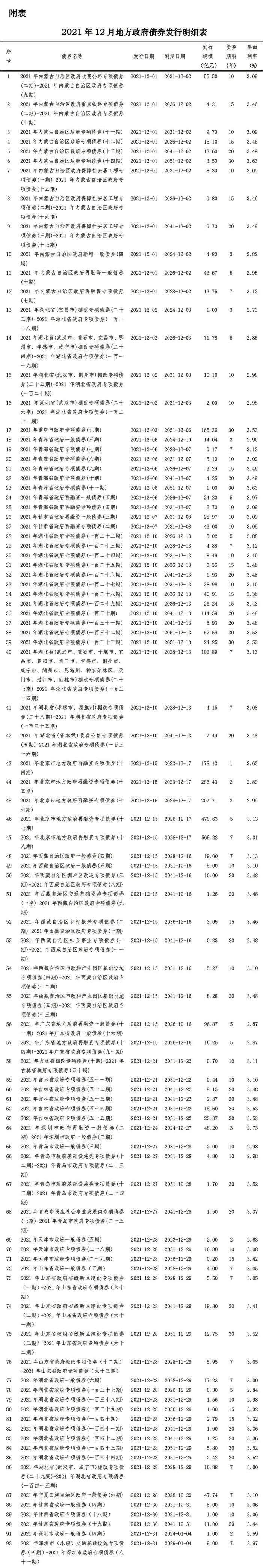 12月,全国14个省、自治区、直辖市、计划单列市1共发行地方政府债券92只,金额合计3,178.97亿元。具体情况如下:
