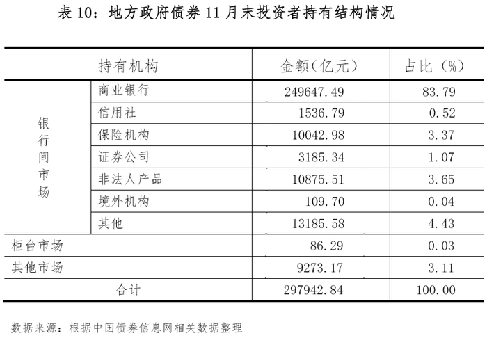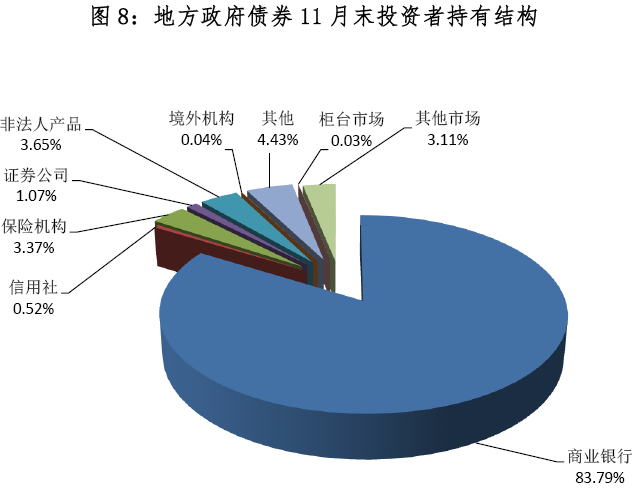 截至11月末,银行间债券市场投资者持有地方政府债券288,583.38亿元,占比96.86%;柜台市场投资者持有86.29亿元,占比0.03%;其他市场投资者持有9,273.17亿元,占比3.11%。银行间债券市场投资者中,商业银行持有249,647.49亿元,占比83.79%;保险机构持有10,042.98亿元,占比3.37%;非法人产品持有10,875.51亿元,占比3.65%;其他境内机构持有17,907.71亿元, 占比6.01%;境外机构持有109.70亿元,占比0.04%。地方政府债券11月末投资者持有结构情况见表10、图8。