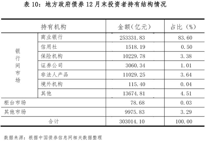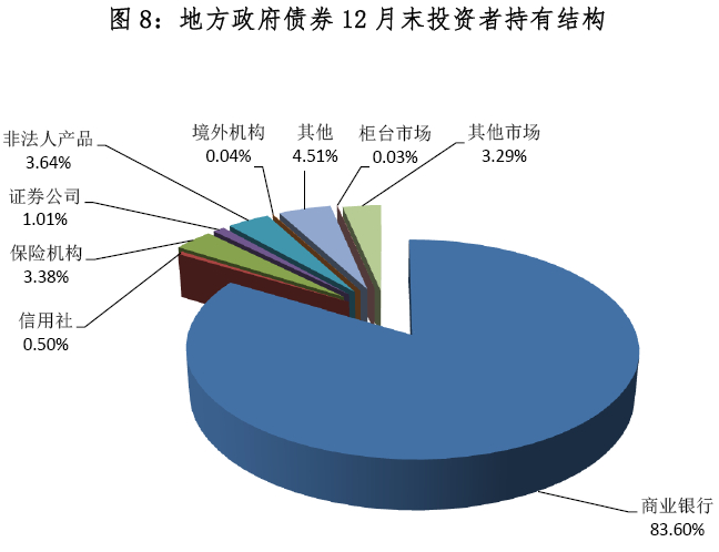 截至12月末,银行间债券市场投资者持有地方政府债券292,959.59亿元,占比96.68%;柜台市场投资者持有78.68亿元,占比0.03%;其他市场投资者持有9,975.83亿元,占比3.29%。银行间债券市场投资者中,商业银行持有253,331.83亿元,占比83.60%;保险机构持有10,229.78亿元,占比3.38%;非法人产品持有11,029.25亿元,占比3.64%;其他境内机构持有18,253.34亿元, 占比6.02%;境外机构持有115.40亿元,占比0.04%。地方政府债券12月末投资者持有结构情况见表10、图8。