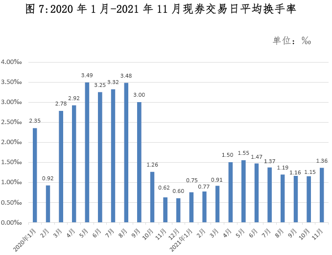 1-11月,地方政府债券二级市场现券交易金额72,937.53亿元。其中,银行间债券市场71,387.82亿元,上海证券交易所1533.47亿元,深圳证券交易所16.24亿元。1-11月地方政府债券二级市场现券交易情况见表9,2020年1月-2021年11月现券交易日平均换手率见图7。