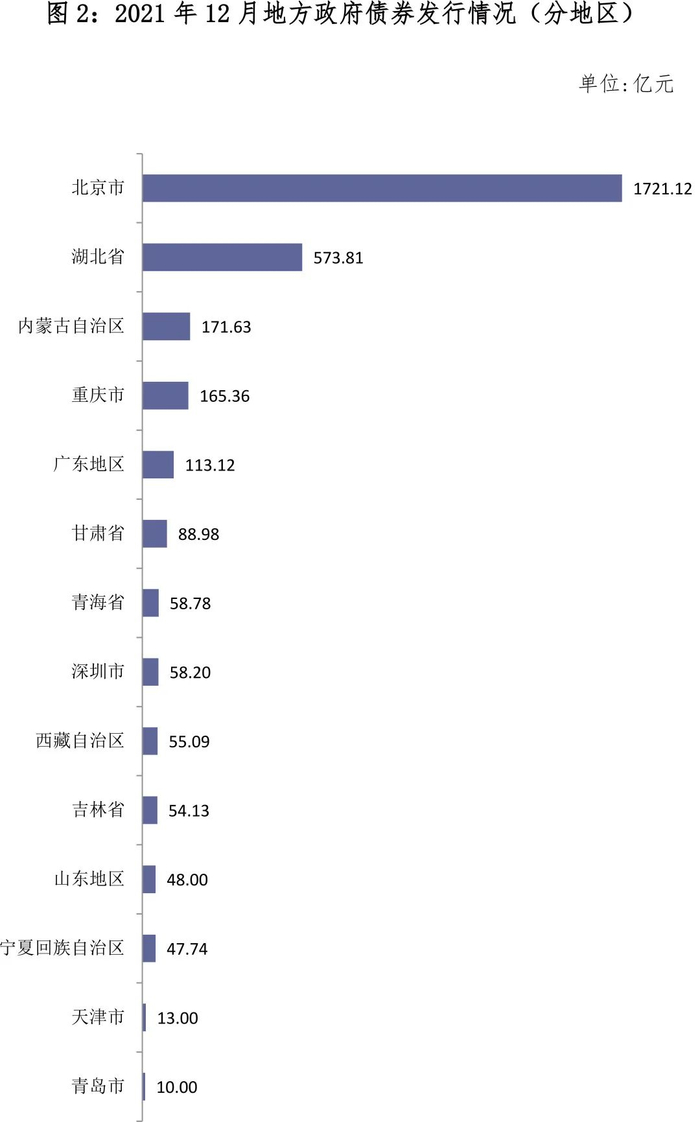 从发行地区看,14个省、自治区、直辖市、计划单列市12月发行了地方政府债券(见表2)。债券发行规模较大的有北京市1,721.12亿元、湖北省573.81亿元(见图2)。