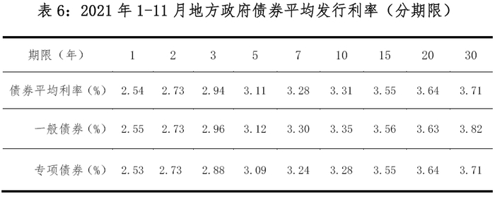 1-11月,地方政府债券平均发行利率3.37%,比2020年同期下降3bp。其中,一般债券3.27%,专项债券3.42%。2021年1-11月不同期限地方政府债券平均发行利率见表6。