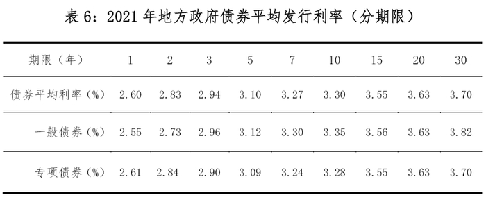 2021年,地方政府债券平均发行利率3.36%,比2020年下降4bp。其中,一般债券3.26%,专项债券3.41%。2021年不同期限地方政府债券平均发行利率见表6。