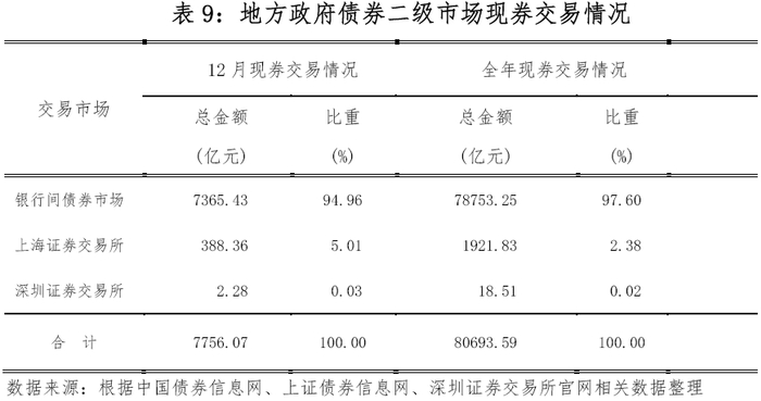 12月,地方政府债券二级市场现券交易金额7,756.07亿元。其中,银行间债券市场7,365.43亿元,上海证券交易所388.36亿元,深圳证券交易所2.28亿元。当月现券交易日平均换手率为1.12‰。