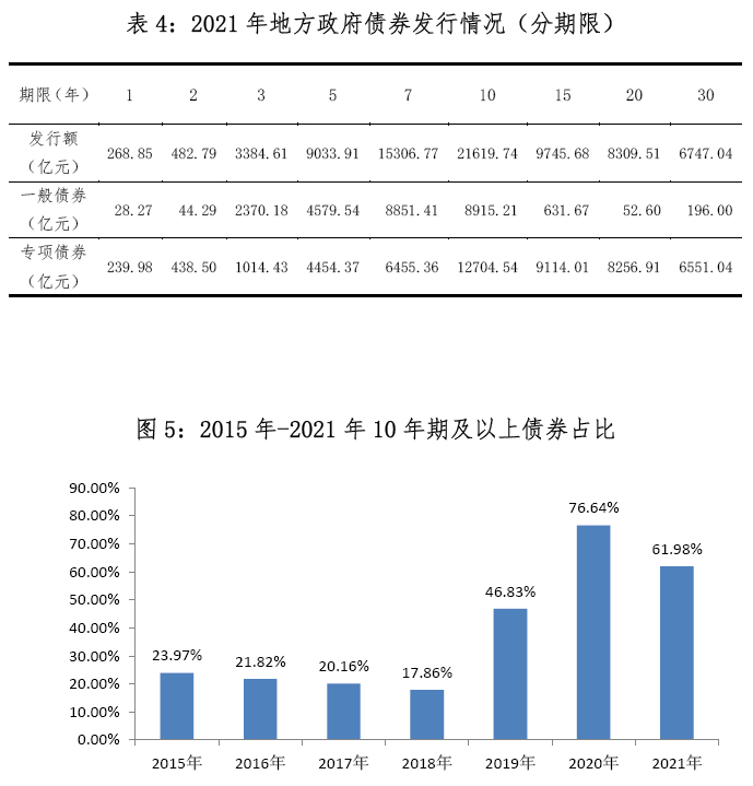 2021年,地方政府债券平均发行期限11.95年,比2020年减少2.7年。其中,一般债券7.7年,专项债券14.16年。不同期限债券发行规模见表4。10年期及以上债券46,421.97亿元,占比61.98%。2015年-2021年10年期及以上债券占比见图5。