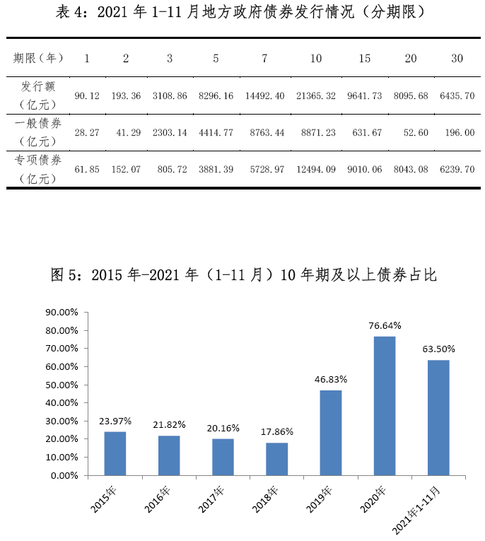 1-11月,地方政府债券平均发行期限12.07年,比2020年同期减少2.77年。其中,一般债券7.73年,专项债券14.44年。不同期限债券发行规模见表4。10年期及以上债券45,538.43亿元,占比63.50%。2015年-2021年(1-11月)10年期及以上债券占比见图5。