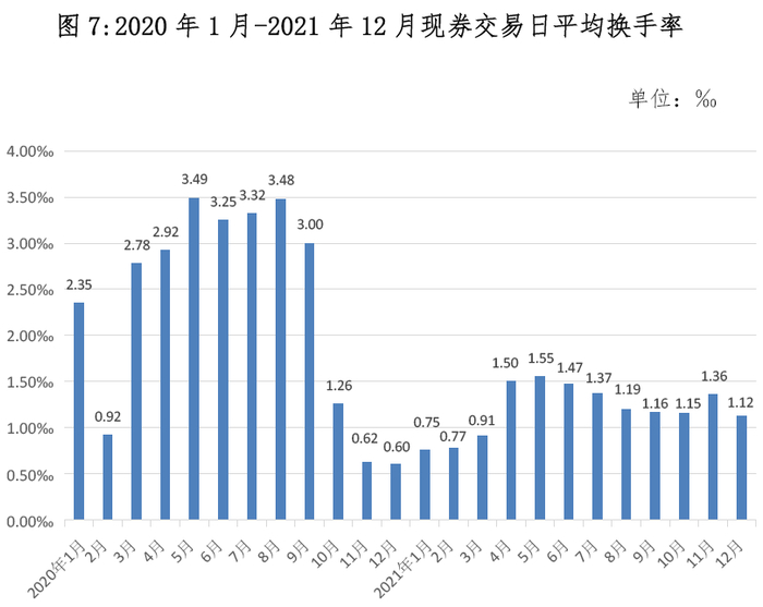 2021年,地方政府债券二级市场现券交易金额80,693.59亿元。其中,银行间债券市场78,753.25亿元,上海证券交易所1921.83亿元,深圳证券交易所18.51亿元。1-12月地方政府债券二级市场现券交易情况见表9,2020年1月-2021年12月现券交易日平均换手率见图7。