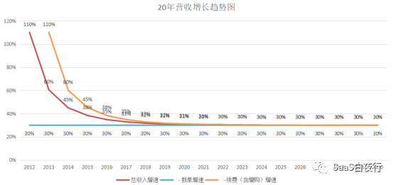 从这张20年营收增速图可以看到,SaaS公司在初期的总收入增速很高,这来自“续费”的红利。新单增速保持30%不变的情况下,续费(含老客户增购)在总收入的占比从第2年的38%,很快提高到第3年的50%,第4年开始则达到62%。