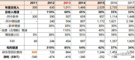 (以上绿底色格子中的数字即为每年新购的金额,蓝色格子中为前一年新签客户在此年续费及增购金额,单位为:万元)