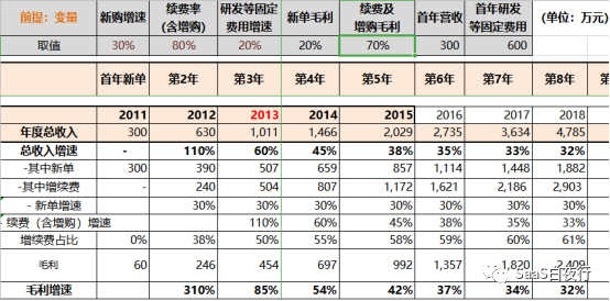 相对而言,SaaS公司的续费成本不高,对应成本只有客户成功团队的薪酬、奖金及管理费用。所以我们假定该公司的续费毛利为70%。