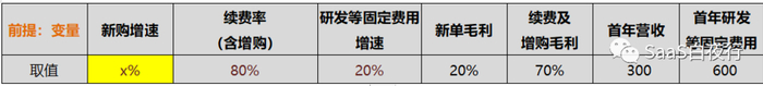 从营销视角看,SaaS公司的变动成本是与“销售额”相关的成本,也就是上面说的获客成本(CAC)80%及续费成本30%。对应的是新单毛利率=1 - 80% = 20%,续费毛利率=1 - 30% = 70%