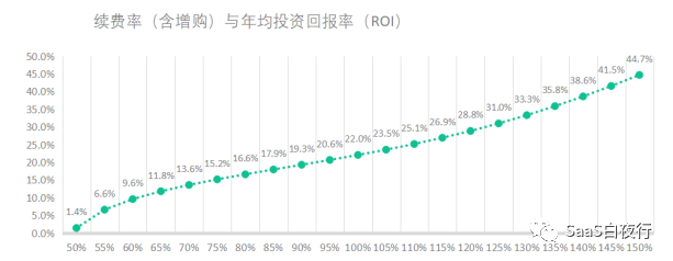 当续费率(含增购)超过85%之后,回报率则会呈现加速增长。如果能将包含增购的续费率提升到100%以上,回报率的增速更明显。
