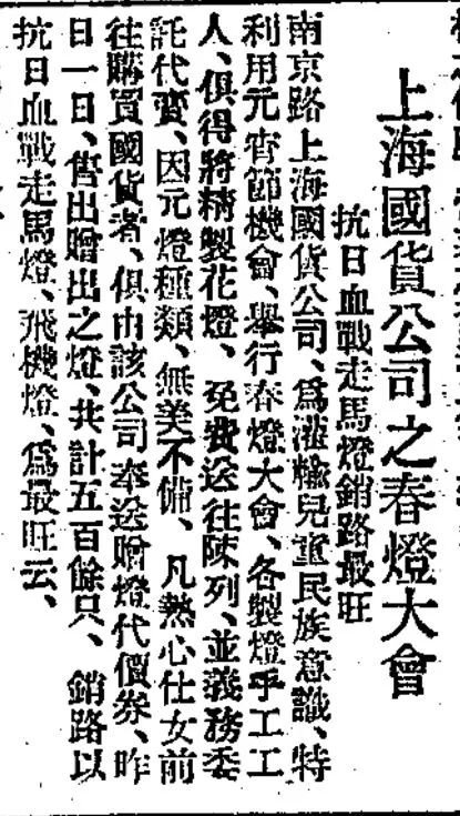 比如这则题为“上海国货公司之春灯大会”的短消息中就提到:“抗日血战走马灯销路最旺。南京路上海国货公司、为灌输儿童民族意识,特利用元宵节机会,举行春灯大会,各制灯手工工人,俱得将精制花灯,免费送往陈列,并义务委托代卖,因元灯种类,无美不备,凡热心人士前往购买国货者,俱由该公司奉送赠灯代价券,昨日一日,售出赠出之灯,共计五百余只,销路以抗日血战走马灯、飞机灯、为最旺云”