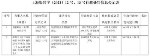 2月9日,渣打银行(中国)因违反信用信息查询相关管理规定,被央行上海分行处以罚款230万元并责令限期改正。时任渣打银行(中国)零售个人金融信贷部信贷总监陈燕来,对渣打银行上述的违法违规行为负有责任,被处以罚款人民币10万元。