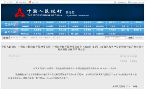 自2022年3月1日起,央行等三部门发布的《金融机构客户尽职调查和客户身份资料及交易记录保存管理办法》将正式实施。