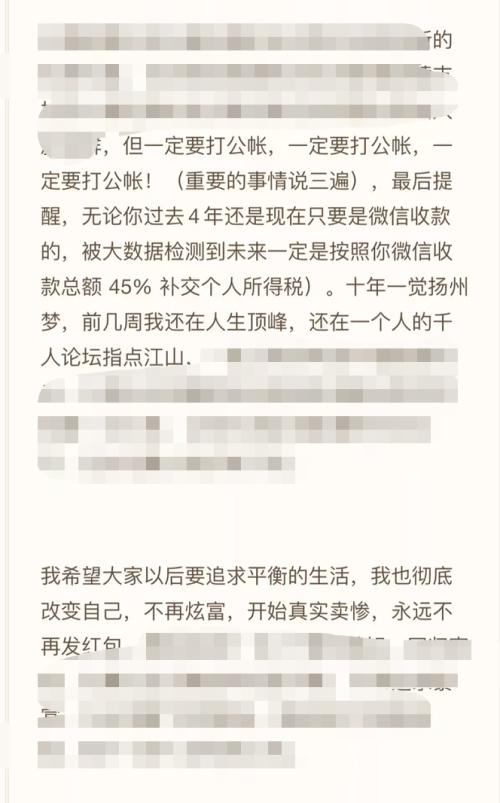 公开信中讲到,此后为其新社群付费“一定要打公账”。“无论你过去4年还是现在只要是微信收款的,被大数据检测到未来一定是按照你微信收款总额45%补交个人所得税。”
