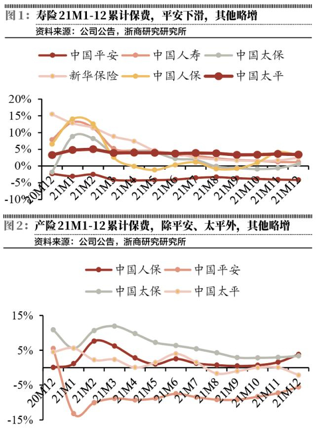 随着主要上市险企2021年12月保费数据发布完毕,寿险累计保费增速总体稳定、产险累计保费全面修复,由此可以做出一个基本的判断:寿险持续承压,车险逐步改善。