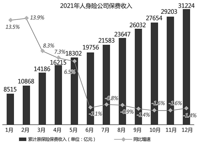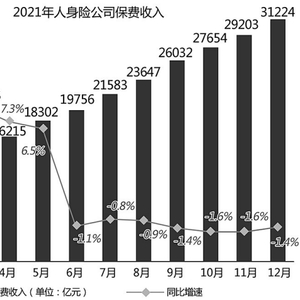 2021年,人身险公司累计实现原保险保费收入3.1万亿元,同比下降1.4%。具体来看,寿险业务累计实现原保险保费收入2.4万亿元,同比下降1.7%;意外险业务累计实现原保险保费收入583亿元,同比下降7.9%。