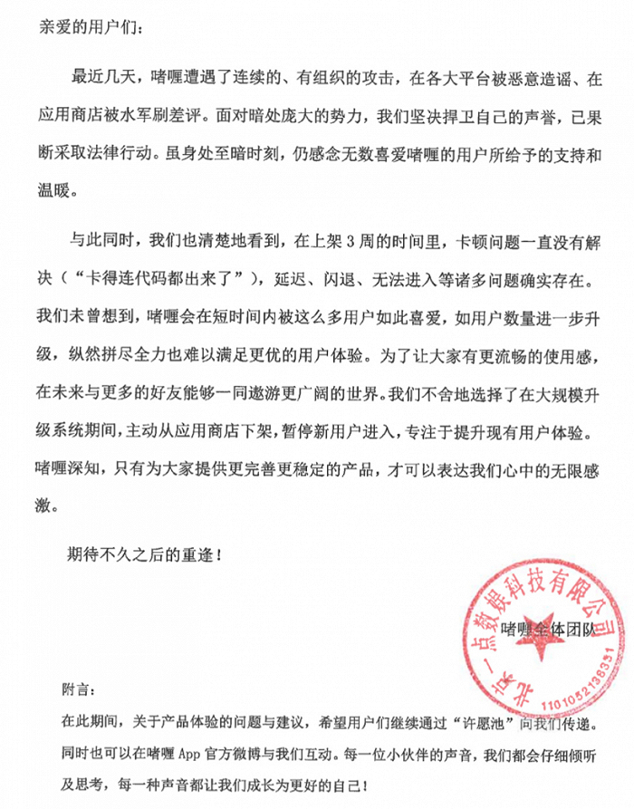 不过,随着「啫喱」的水涨船高,外界也透露出了一些不和谐的声音,主要集中在网传侵犯用户隐私等问题上,更是遭遇了连续的、有组织的攻击,在各大平台被恶意造谣、在应用商店被水军刷差评。「啫喱」官方也针对此发布了声明,但是奈何头部的位置太显眼,终于在2月13日晚间选择了主动从应用商店下架暂停新用户进入,专注于提升现有用户体验。
