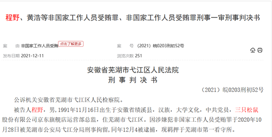 裁判文书网公布的另一则判决书显示,被告人程野,男,1991年11月16日出生于安徽省绩溪县,大学文化,三只松鼠股份有限公司京东旗舰店运营部总监,住芜湖市弋江区。因涉嫌犯非国家工作人员受贿罪于2020年10月28日被芜湖市公安局弋江分局刑事拘留,同年12月4被逮捕。