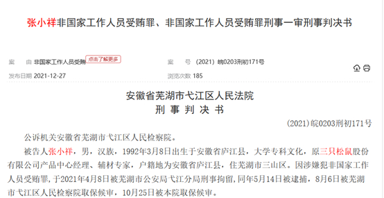 裁判文书网公布的判决书显示,被告人张小祥,1992年3月8日出生于安徽省庐江县,大学专科文化,原三只松鼠股份有限公司产品中心经理、辅材专家,户籍地为安徽省庐江县,住芜湖市三山区。因涉嫌犯非国家工作人员受贿罪,于2021年4月8日被芜湖市公安局弋江分局刑事拘留,同年5月14日被逮捕,8月6日被芜湖市弋江区人民检察院取保候审,10月25日被法院取保候审。