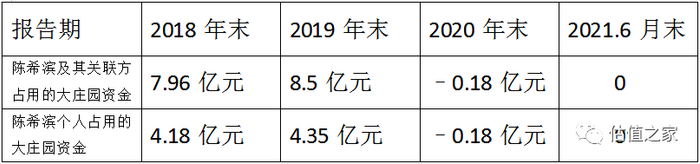 2018年初,被实控人陈希滨及其关联方占用的大庄园资金为6.93亿元(陈希滨个人占用4.01亿元),2018年末这一数据上升至7.96亿元(陈希滨个人占用4.18亿元),2019年末这一数据更是达到了8.5亿元的峰值(陈希滨个人占用4.35亿元)。