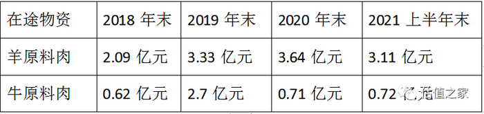 此外,2019年年末6.05亿元的“在途物资”中,羊原料肉为3.33亿元,牛原料肉为2.7亿元,其中,牛原料肉在途物资余额远高于其他各期末。