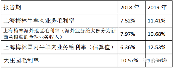 估值之家根据上海梅林各期年报中的牛羊肉毛利率、牛羊肉国内收入(新西兰银蕨中国销售收入+联豪食品收入)、海外业务收入结构、海外业务综合毛利率等数据,大致估算出上海梅林2018年、2019年国内牛羊肉业务的毛利率分别为6.36%左右、12.53%左右,均大幅低于大庄园。