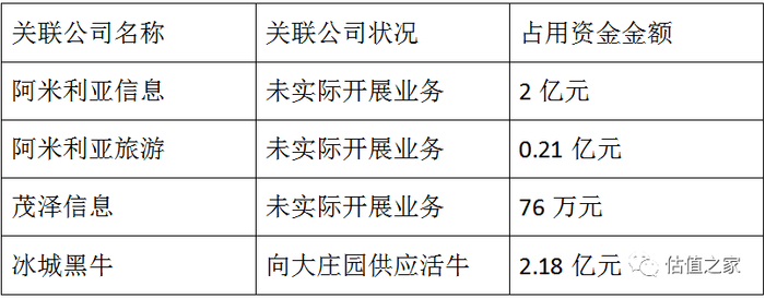 这7家关联公司中,有4家曾经占用过大庄园的资金。下表是2020年年初这4家关联公司占用大庄园资金的明细: