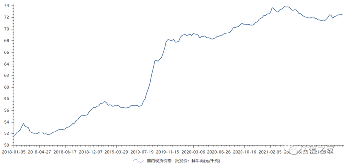 再以国内鲜牛肉批发价格为例,2019年11月1日价格为66.71元/公斤,12月27日价格为67.75元/公斤,期间小幅震荡走高。