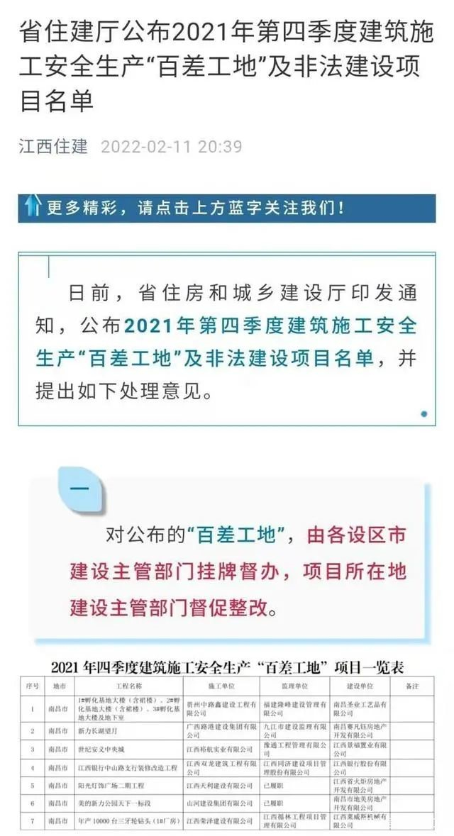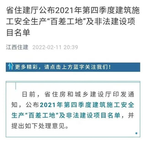 上述通知要求,各地于2022年2月20日前,将“百差工地”及非法建设项目整改情况、处理情况汇总报送至厅安委办。(本文图片均来自江西住建官方微信公众号截图)