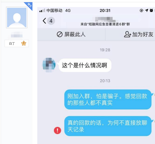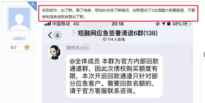 记者在百度贴吧“短融网吧”看到,有多位网友被拉进了所谓的短融网清退QQ群。一位网友在“清退 6群”内质疑,客服就马上将其移出了QQ群。
