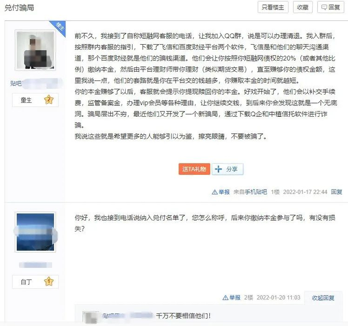 一网友发贴称,他入群后,按照群内客服的指引,下载了飞信和百度财经平台两个软件,前者用于和客服聊天沟通,后者则要求注册缴存短融网债权的20%,然后由平台理财师带着理财(类似期货交易),直至赚够你的债权金额。“他们的套路就是你在平台交的钱越多,你赚取本金的时间就越短。”这位网友指出。